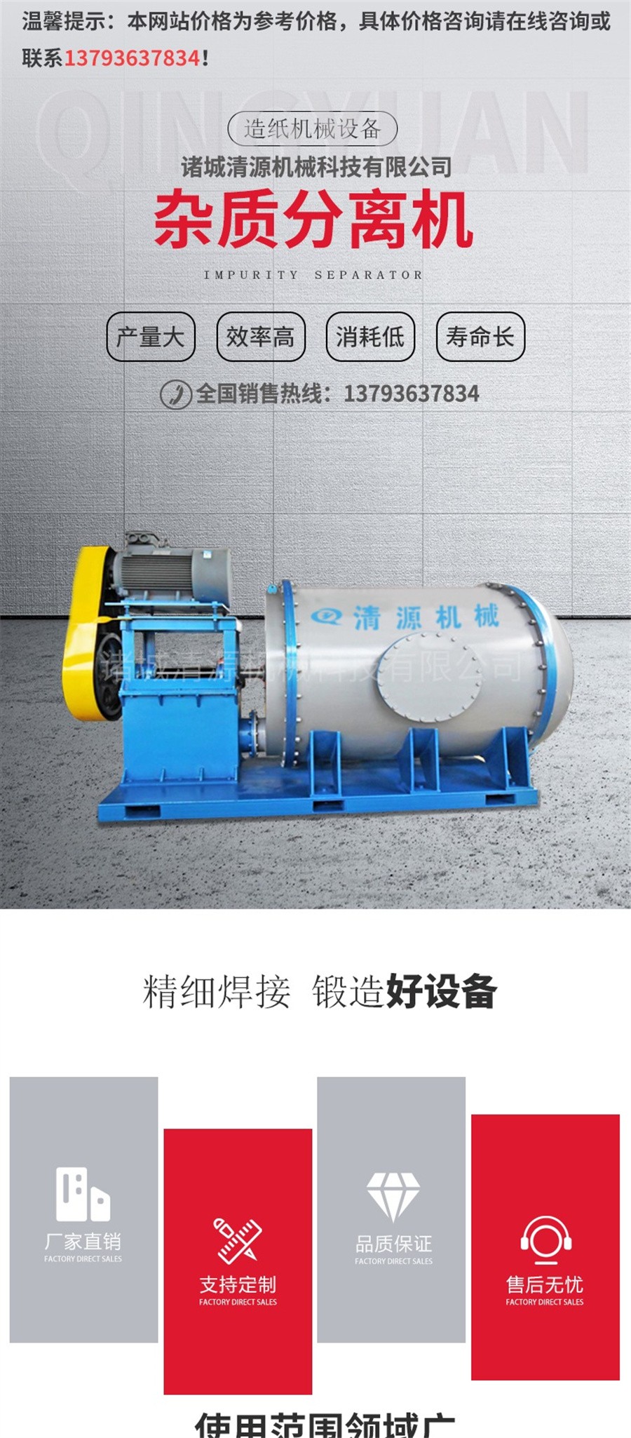 雜質分離機內有特別設計的低摩擦葉片水力型轉子,能使進入的漿料均勻分散,保持篩板不阻塞并防止雜質破碎。輕雜質經粗選機頂部出口排出,進入圓筒篩進行進一步的分離,重雜質經粗選機的底部排出,除雜后的漿料經過后部篩板由出漿管送出。